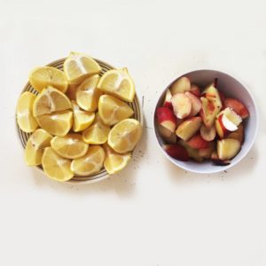 1. Coupez les pêches en morceaux et les citrons en 4.