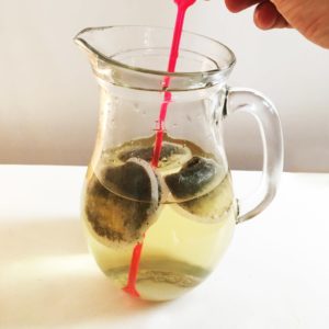 Ajoutez votre litre d’eau sucrée et les sachets de thé. Astuce : coincez les sachets sous le poids des fruits pour qu’ils massèrent bien et évitent de flotter en surface :