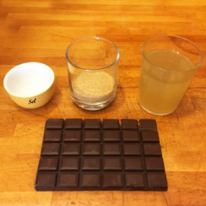 Réunissez : Chocolat / Sucre blanc (ou sucre de canne) / Eau de pois chiches / Sel