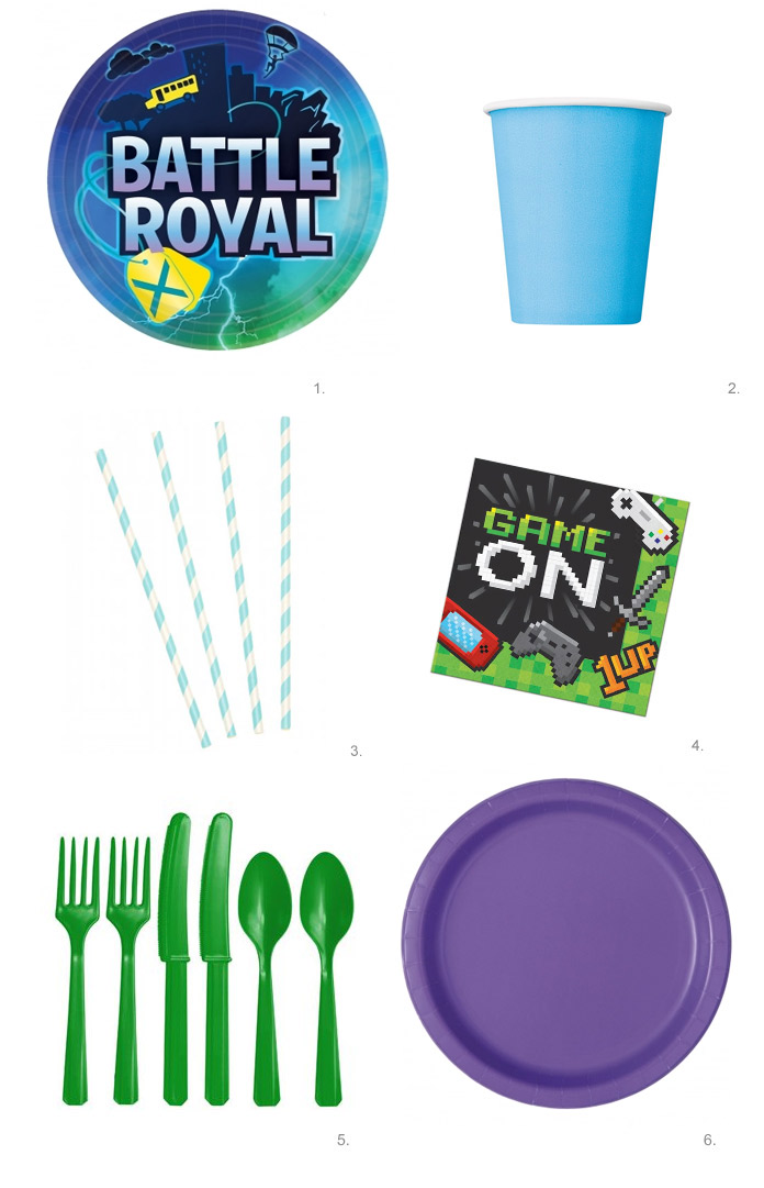 Voici notre sélection d’idées ci-dessous : 1. Assiettes Battle Royale, 2. Gobelets bleus en carton, 3. Pailles en carton, 4.Serviettes en papier jeux vidéo, 5. couverts verts, 5. Assiettes en carton mauves