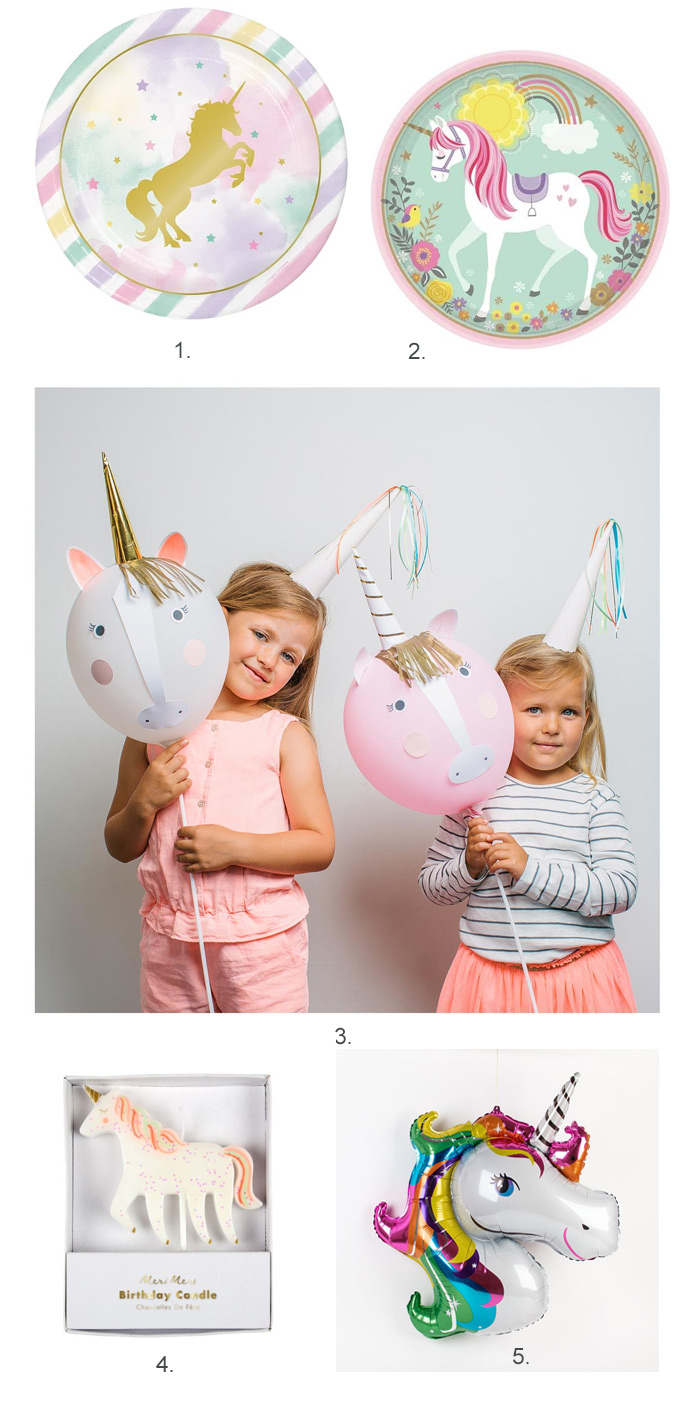 Voici notre sélection d’idées ci-dessous : 1. Kit anniversaire licorne chez Party City, 2. Assiettes licornes chez Thema Deco, 3. Kit de ballons licornes DIY chez Jolie Nouba, 4. Bougie licorne chez Oxybul, 5. Ballon mylar tête de licorne chez Sweet Party