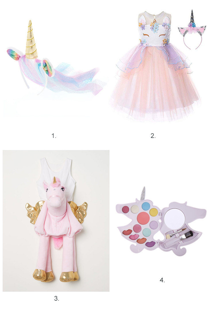 Quelques idées shopping pour vous inspirer : 1.Serre-tête Licorne avec voile chez Claire’s, 2.Déguisement Licorne chez Amazon, 3.Déguisement Licorne chez H&M, 4. Palette de maquillage en forme de Licorne chez Claire’s