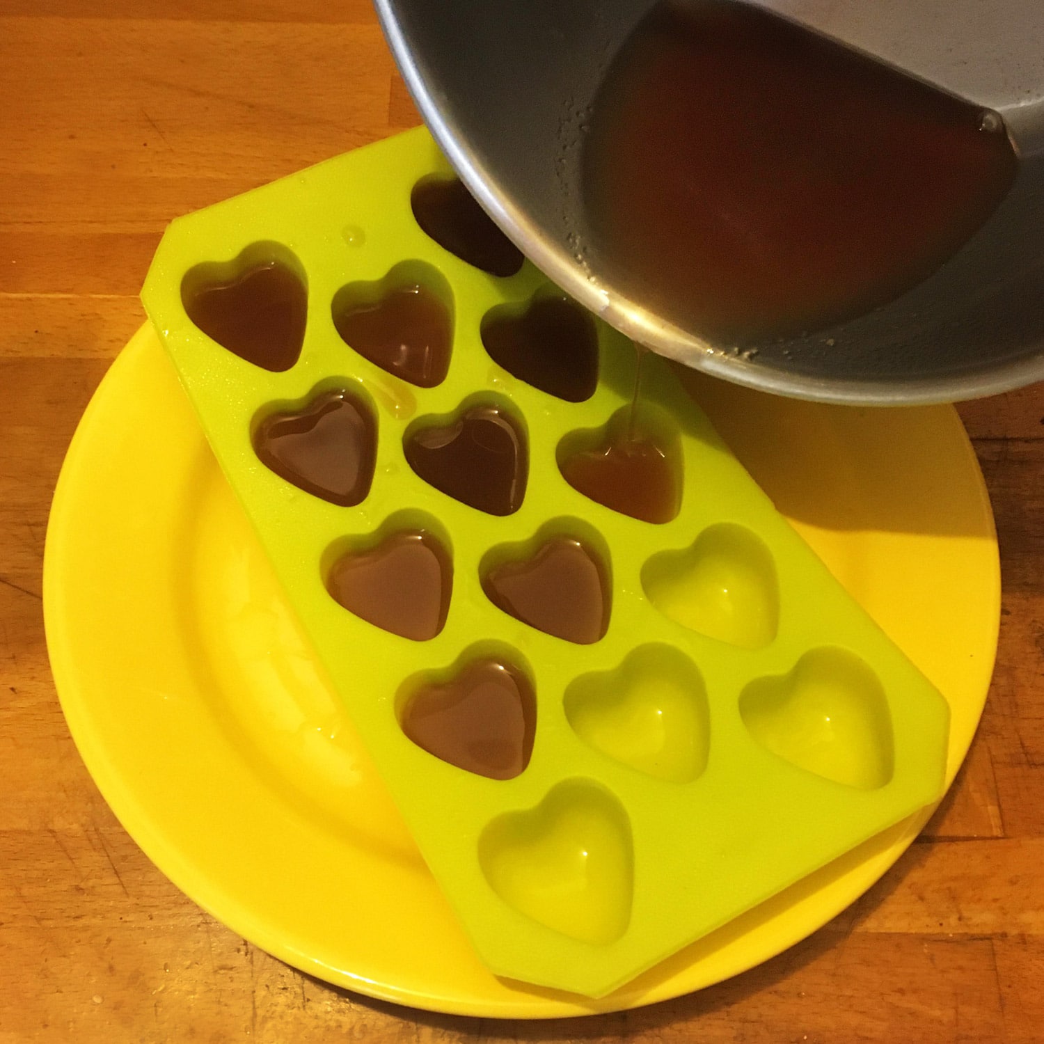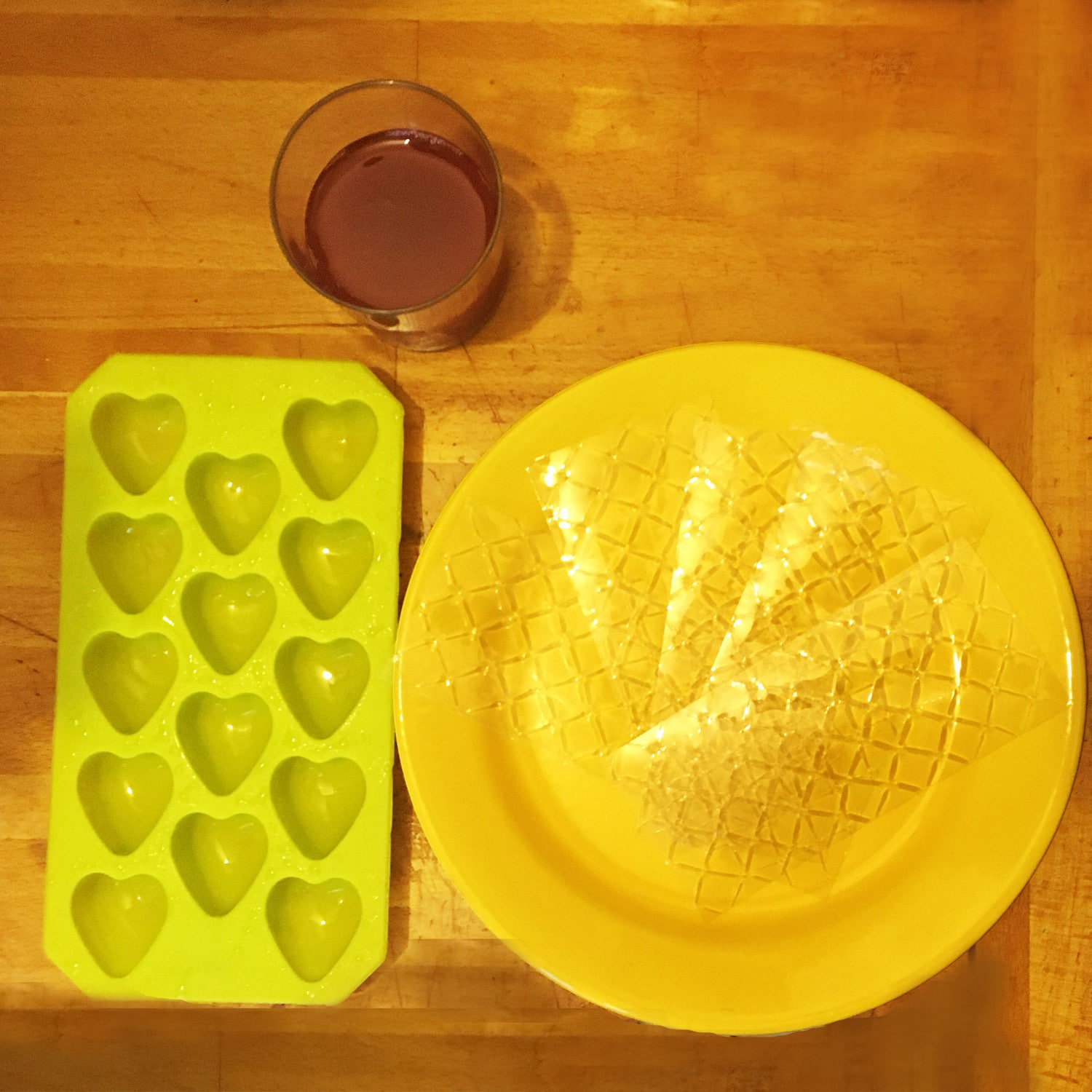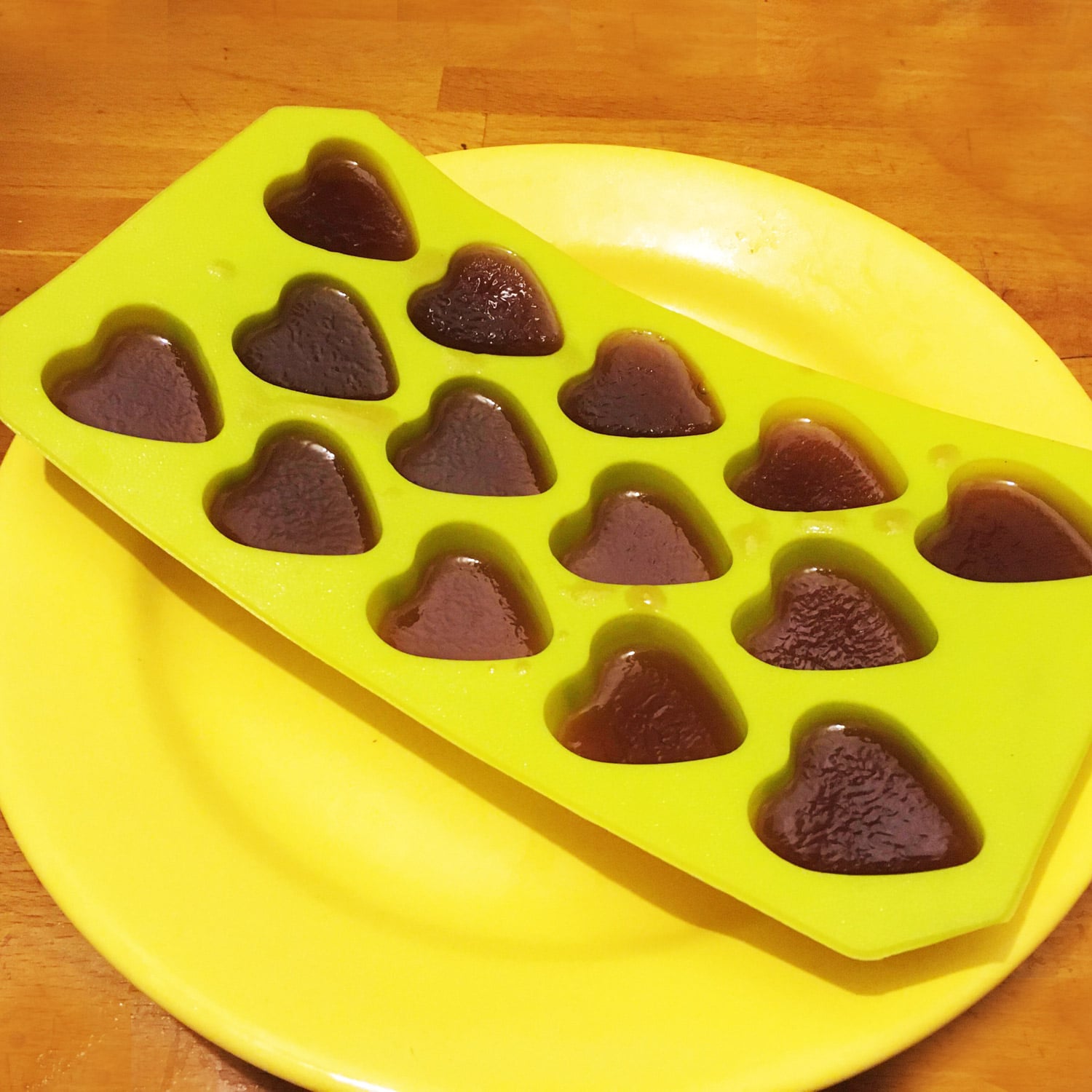 - Répartir le liquide dans des moules souples (un moule à glaçons avec des motifs sympathiques par exemple) préalablement tapissés d’huile de coco pour éviter une éventuelle accroche.