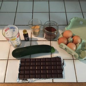 Réunissez : Farine / Extrait de Vanille / Stévia (ou sucre de canne) / Cacao en poudre / Oeufs / Courgette / Chocolat pâtissier
